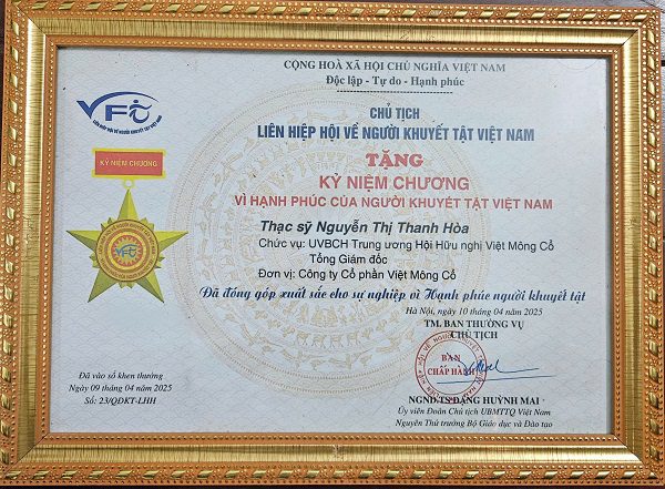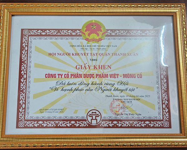 Đặc biệt, Công ty Cổ phần Việt Mông Cổ (Dược phẩm Vimos) cũng đã được Hội Người Khuyết tật Quận Thanh Xuân trao tặng Giấy khen vì “Đã luôn đồng hành cùng Hội ‘Vì hạnh phúc của Người khuyết tật’”. Đây là sự khích lệ to lớn, khẳng định những nỗ lực bền bỉ của Vimos.