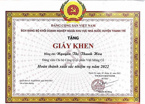 Với việc thực hiện xuất sắc toàn bộ các mặt công tác, chi bộ Công ty Cổ phần Việt Mông Cổ (Dược phẩm Vimos) đã được Đảng ủy Khối Doanh nghiệp huyện Thanh Trì trao tặng Giấy khen Chi bộ hoàn thành xuất sắc nhiệm vụ tiêu biểu năm 2022. Đồng thời, Tổng Giám Đốc Ths Nguyễn Thị Thanh Hòa cũng được trao tặng Giấy khen Đảng viên hoàn thành xuất sắc nhiệm vụ năm 2022. Đây là niềm vinh dự rất lớn cho chi bộ công ty nói riêng và Dược phẩm Vimos nói chung.